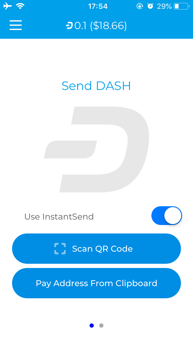 The Send DASH screen gives you two options to enter the payment address: Scan QR Code or Pay Address From Clipboard. You can choose to use InstantSend for instant confirmation, or disable this to send a normal transaction which will require more time for confirmation. Depending on the code you are scanning, the amount of Dash requested may be included, or you can enter it yourself. A confirmation screen will appear to explain the fee structure and request your unlock code (PIN or TouchID). The transaction will then be sent.